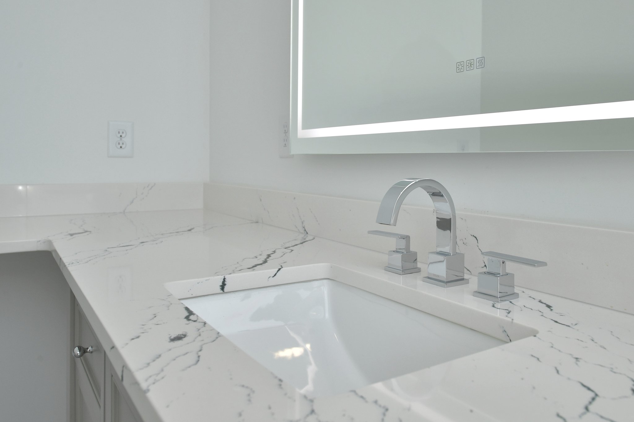 Luxury finishes adorn the ensuite bathroom - dual vanities with large mirrors and anti-fog technology, gray cabinetry with plenty of storage, and Cambria quartz countertops.