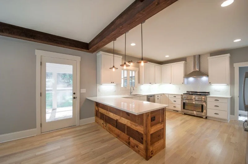 The next photo is from the same renovation-this time the kitchen pendant lights lend a hint of elegance to the artisan functionality of this “Modern Farmhouse” kitchen. The re-purposed decking boards used in lieu of plywood keep the down-home-feel front and center.