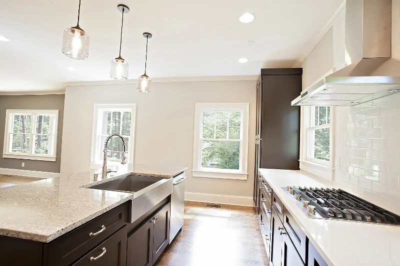 Next is a triptych of smoky glass pendant lights suspended over a granite kitchen island that creates a clean, symmetrical look embodying the aesthetically modern and elegant kitchen.